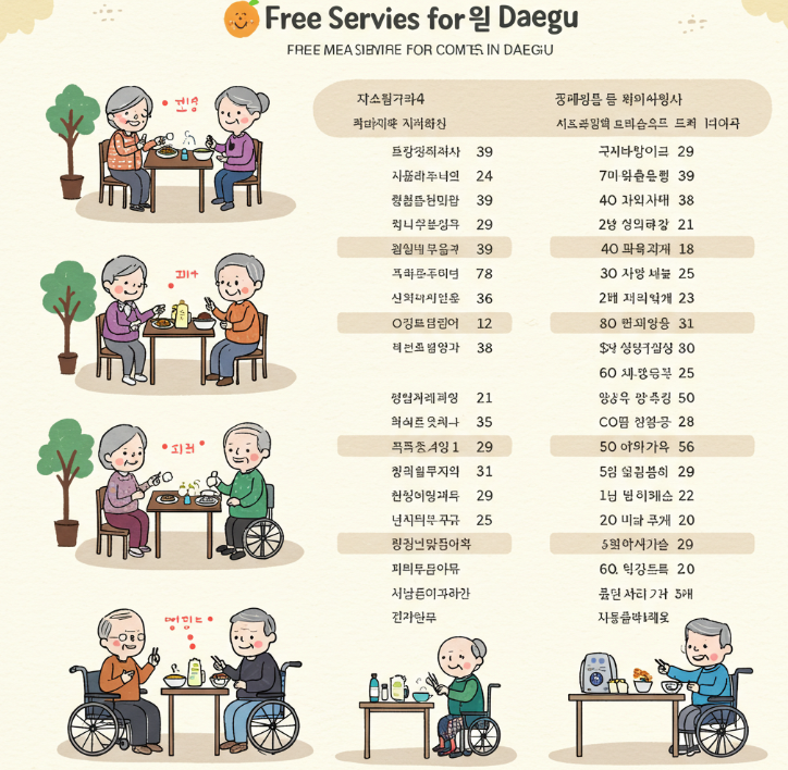 - 여러 복지관에서 운영하며, 만 65세 이상 노인을 대상으로 중식을 제공합니다.