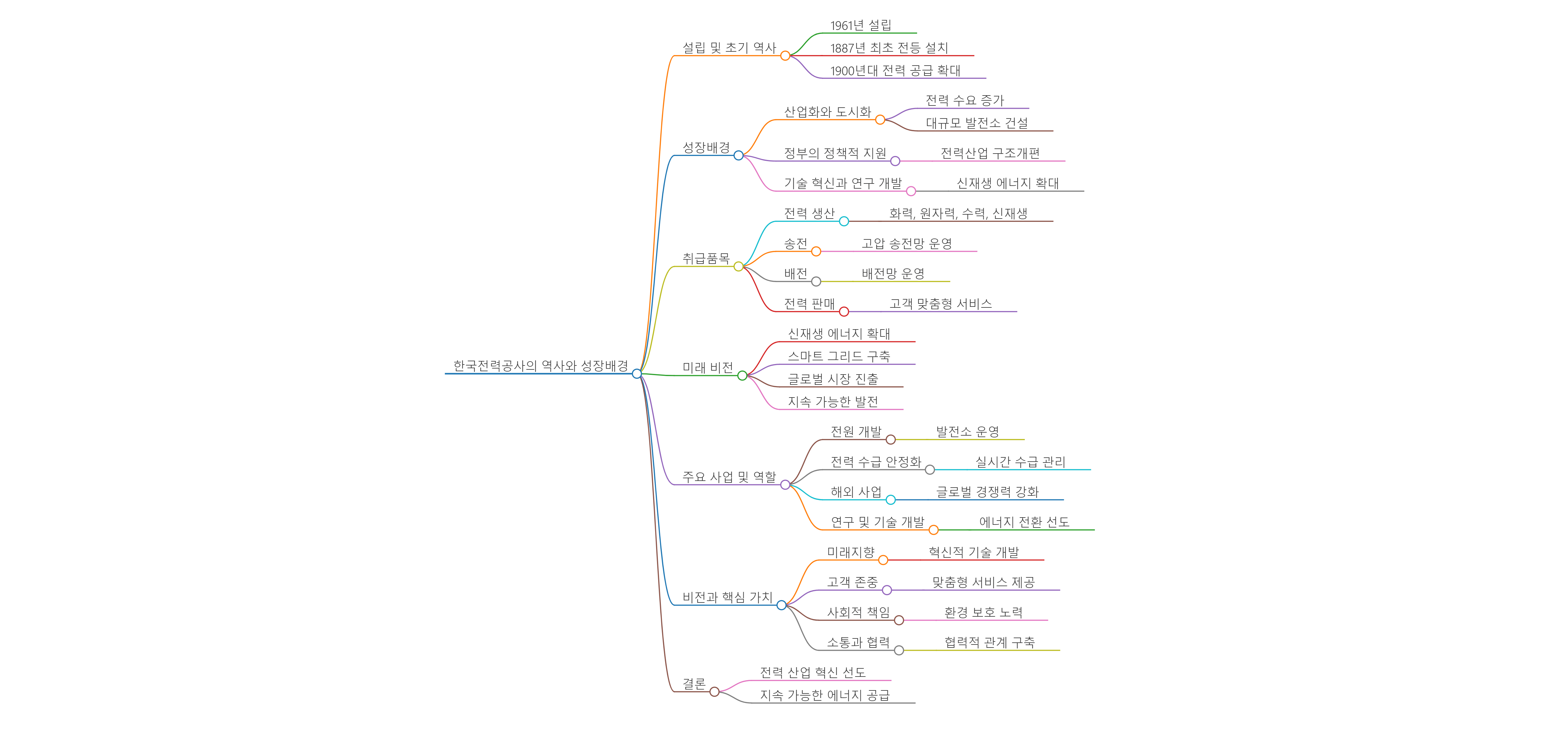 - 전력 생산: 화력, 원자력, 수력, 신재생 에너지 등 다양한 방식으로 전력을 생산합니다.