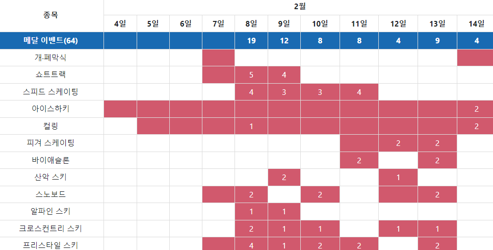 - 아이스하키: 2월 7일 ~ 14일 (남자 대표팀 출전)